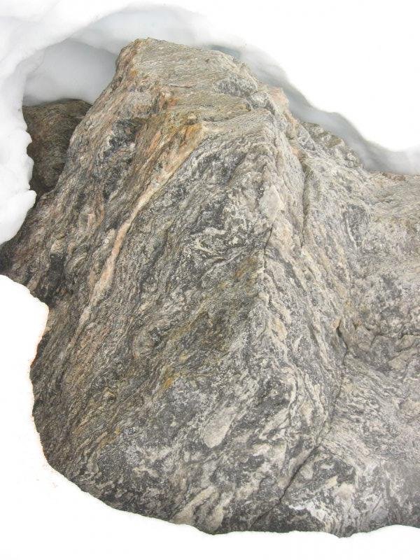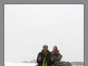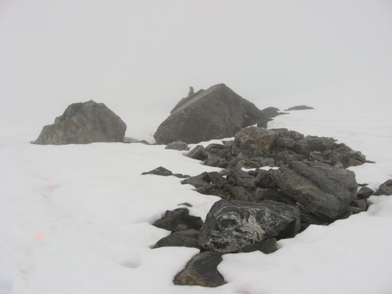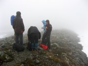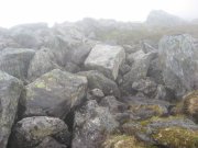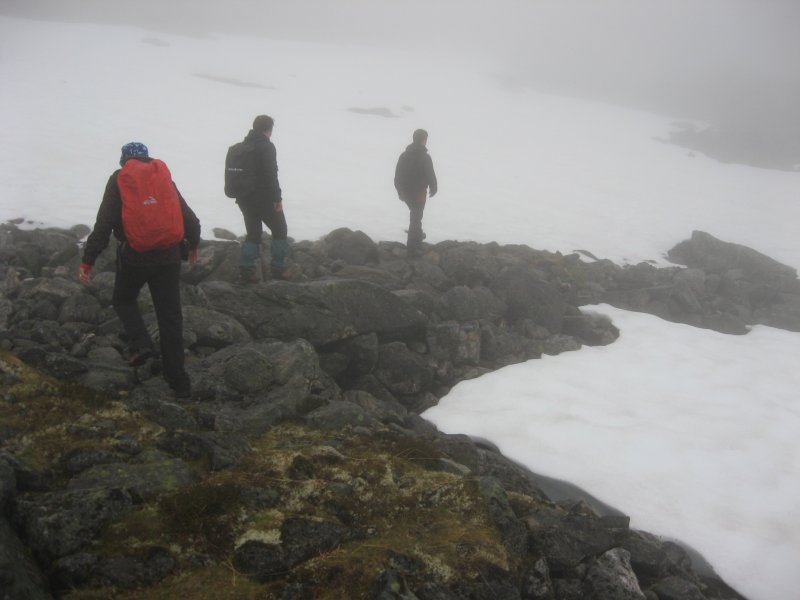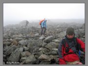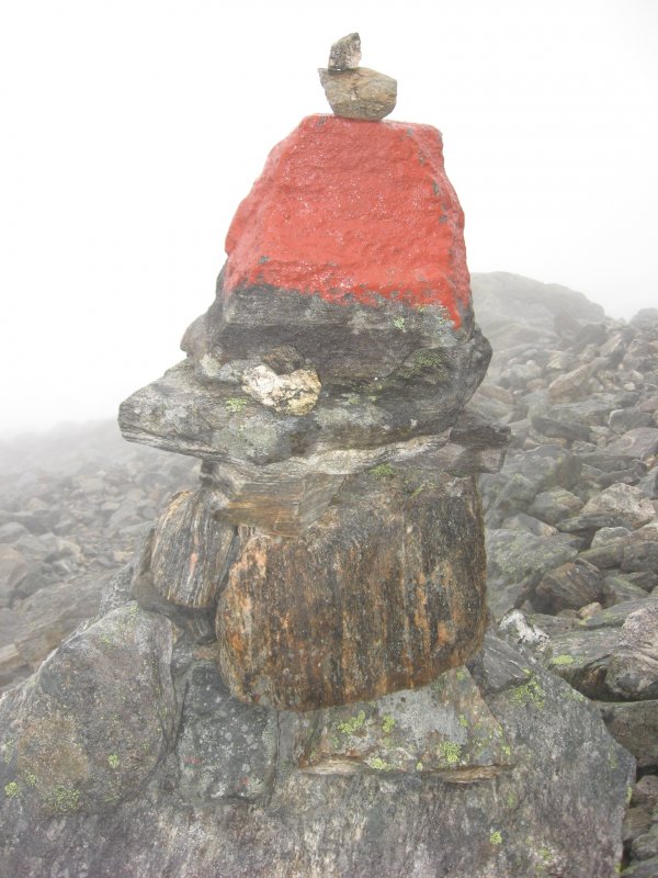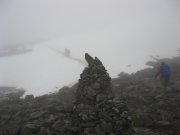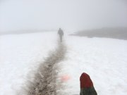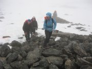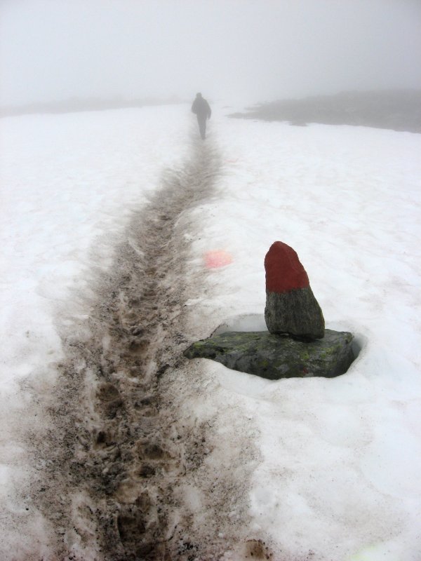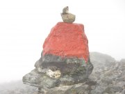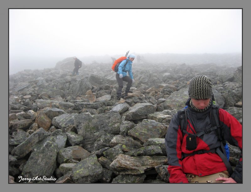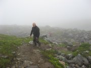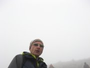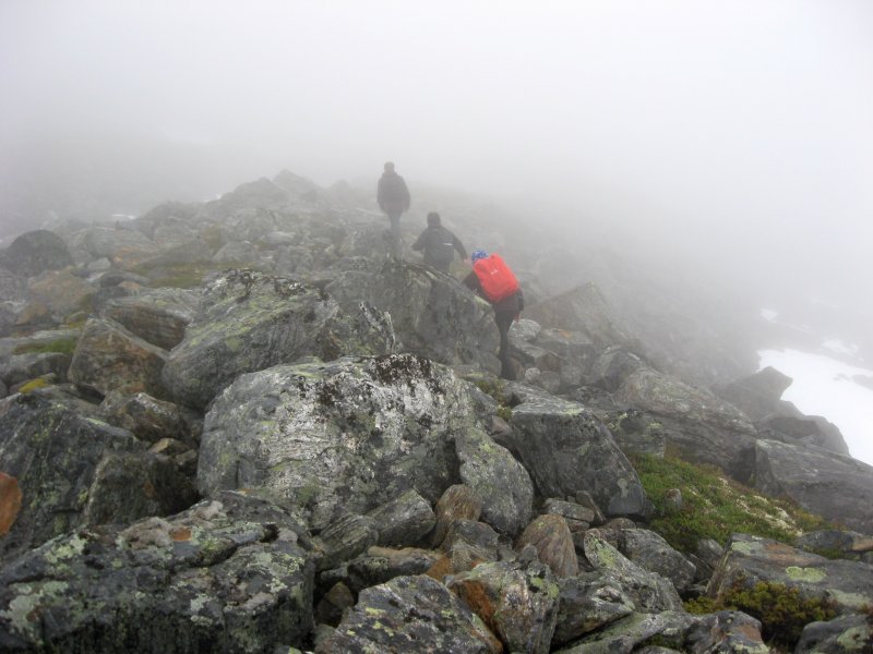 výstup k vrcholu Trolí stěny kamenitým terénem. Je mlha a viditelnost tak