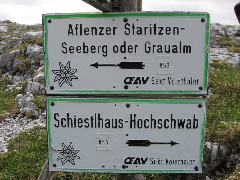 2.den Z Grasser Hütte (1472 m) k chatě Voisthalerhütte (1654 m) a od ní údolím Obere Dullwitz stoupání na hlavní hochschwabský hřeben korunovaný vrcholovým křížem nejvyšší hory Hochschwab (2277 m). Nocleh pod vrcholem na chatě Schiestl Haus (2153 m).