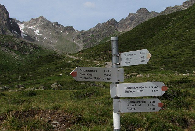 Za půl hodiny se dostaneme nejdřív na značenou zkratku k cestě na sedlo Hochmadererjoch a za krátkou chvíli i k „oficiální“ rozbočce naše cesty se stezkami k sedlu a k Bielerhöhe (k Silvrettastausee). My pokračujeme dále po cestě směrem do hor. Chata je už dobře viditelná a je velice příjemné sledovat, jak se každým absolvovaným kouskem cesty zřetelně přibližuje. Tuto část cesty nám budou zpříjemňovat krávy pasoucí se v bezprostředním okolí. Pozornému oku určitě neujde, že v toto roztroušené stádo hýří neskutečným množstvím barev krav – já jsem alespoň nikde jinde v rakouských Alpách tolik různých zabarvení a odstínů ještě neviděl.