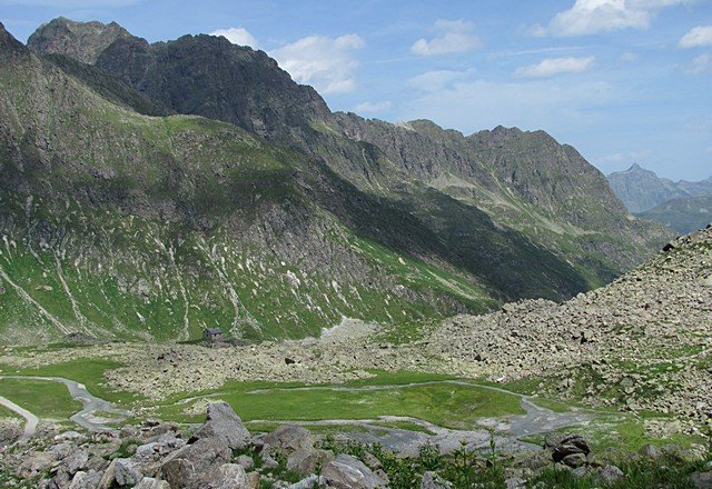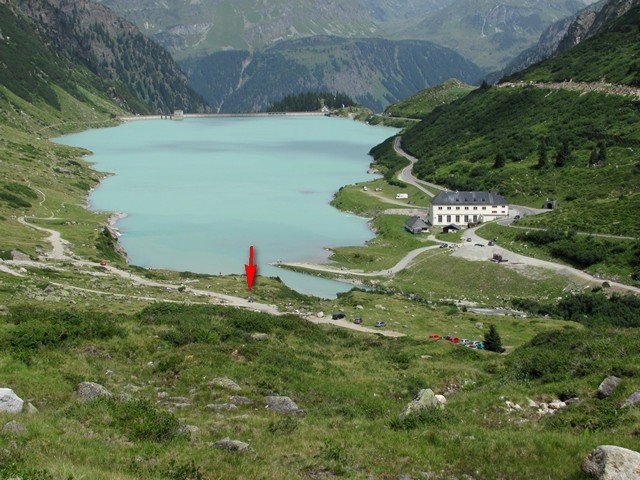Po odpočinku a občerstvení se vydáme stejnou trasou dolů. Překvapivě zjistíme, že značka nás zavede na shora dobře viditelnou stezku, která mnohem víc zkrátí serpentiny štěrkové cesty, takže se na ní vrátíme až na náhorní plošině s kamenným domem, kus za rozbočkou na Bielerhöhe. Tato stezka je však o něco náročnější a požaduje pevnější boty nebo větší jistotu kroku po kamenech a v suti.