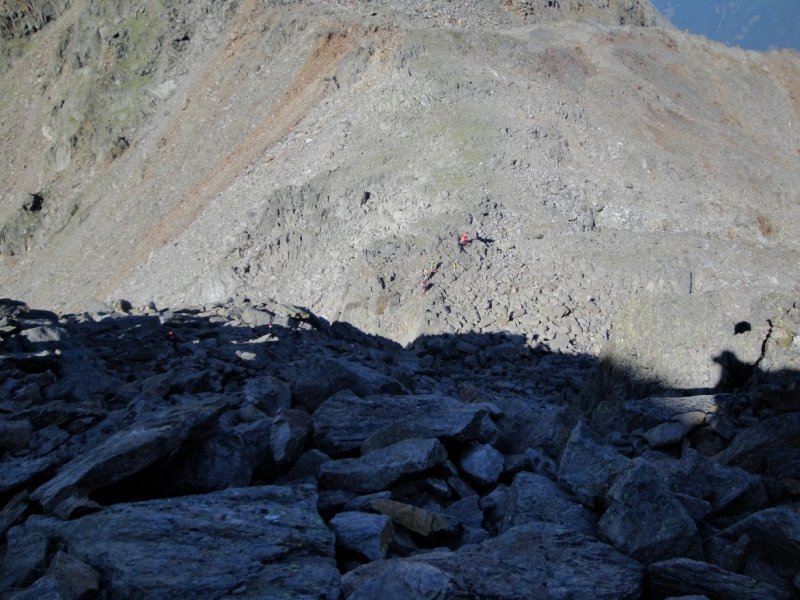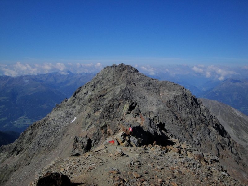 Sestup je v normálním případě stejný jako výstup. Pro ty, co mají jistý krok, se může alternativně doporučit překročení vrcholu. Při tom se jde nejprve prudce nahoru přes skálu, která se stává hrubší a hrubší. Dále přes krátké skalnaté místo jištěné lanem podél vodopádu ke křížení se spojovací cestou z Lienzenu k Hochschoberhütte.