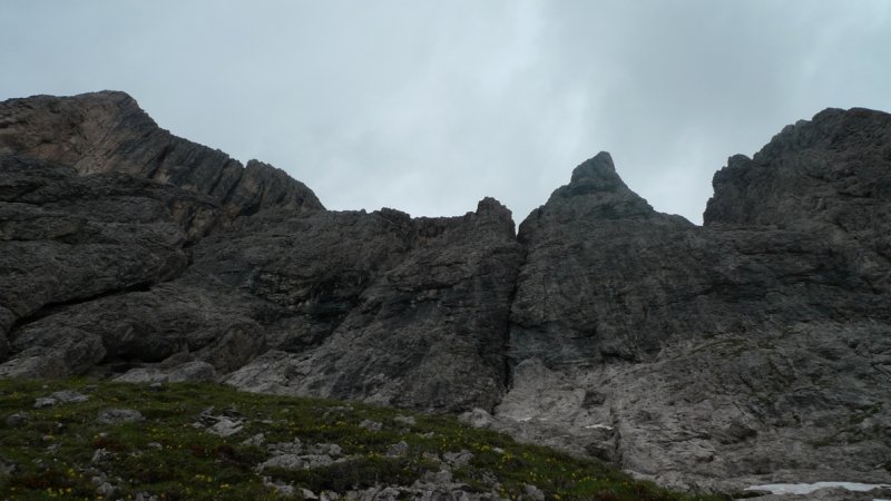 Alternativně: po cestě „Rudl-Eller-Weg“ – přes Weißsteinalm k Hohen Törl Popis této cesty naleznete ZDE Hned za ferátkou Piccola-ferrata, krátký sestup a pak odbočíte doleva a po travnatém svahu k ceduli označující začátek feráty u paty stěny.