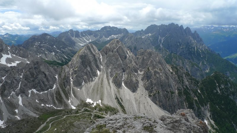 Severovýchodním směrem po neobtížném skalnatém hřebenu do sedla Laserzwandsattel. Pak po značené normálce na chatu Karlsbader Hütte a dále k Dolomitenhütte.
