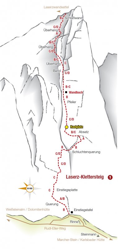 Jedná se o pěknou a náročnou ferátu přímo západní stěnou vrcholu Kleine Laserzwand, 2.568 m. S délkou 620m a převýšením 380m, při značné strmosti a permanentní obtížnosti, je tato feráta opravdovou výzvou pro vytrvalé a kondičně silné lezce po ferátách. V roce 2006 byla celá cesta zajištěna silným nepřerušovaným ocelovým lanem. Obtížnost: dlouhé pasáže C/D, některá místa B, zřídka lehčí